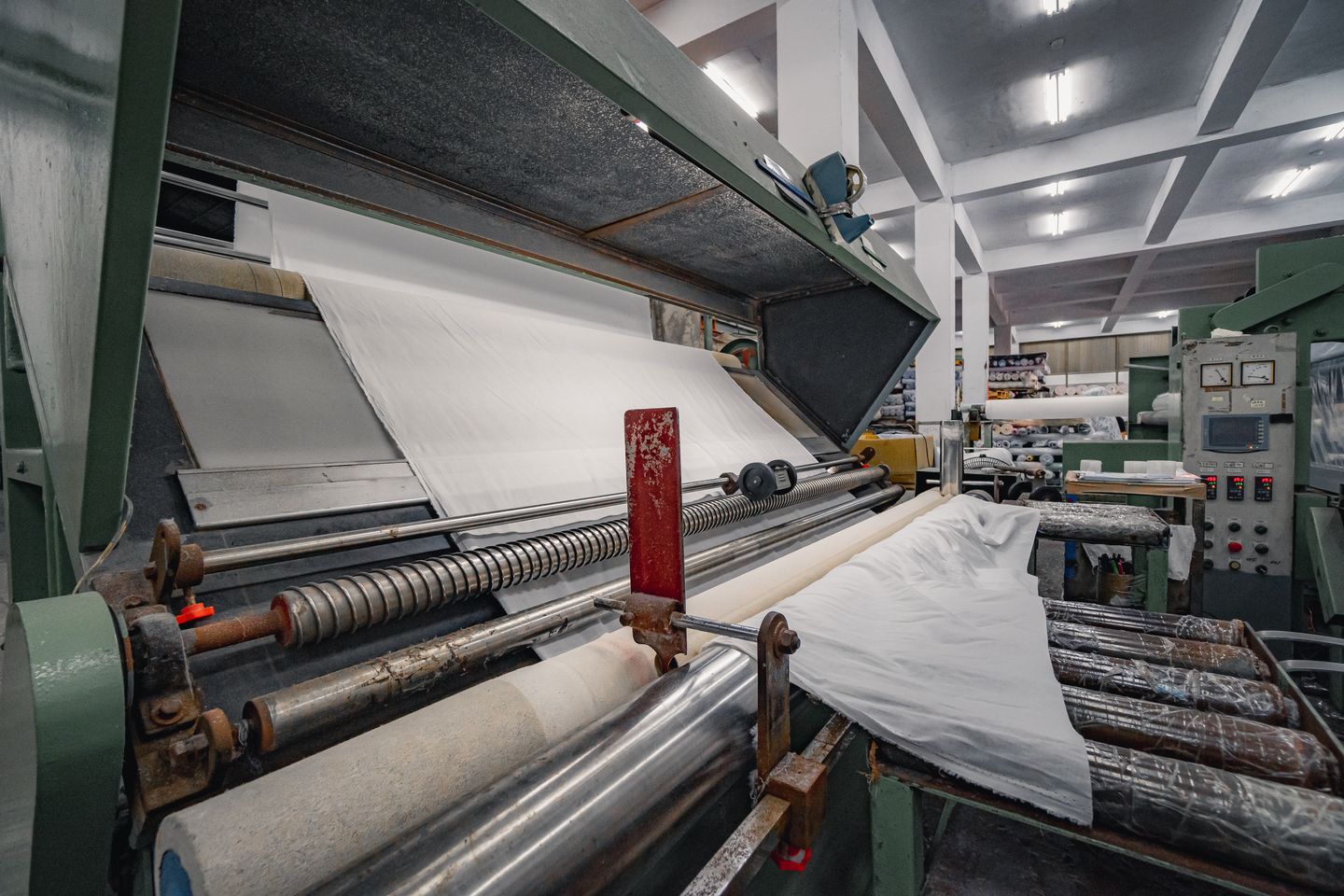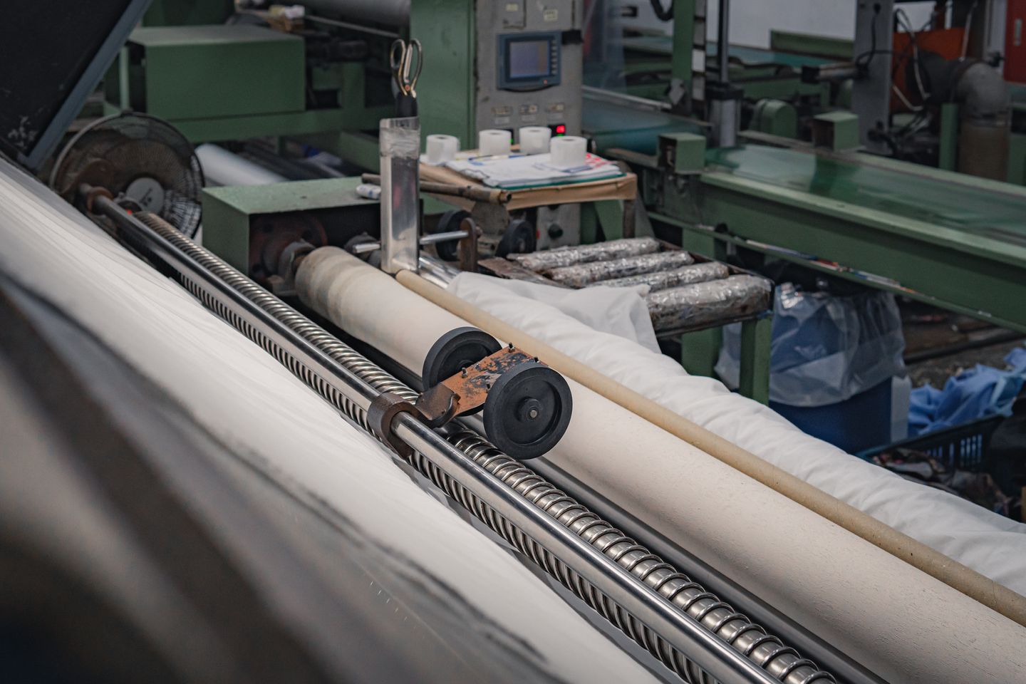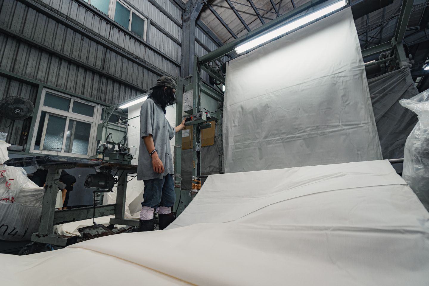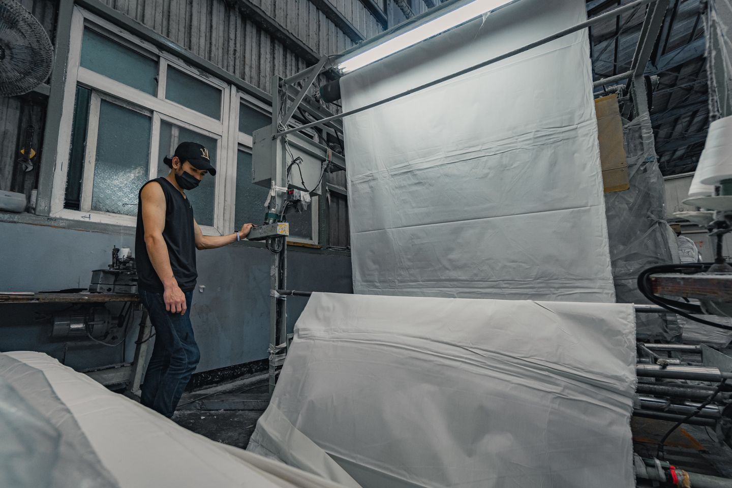 以粗紙管為中心,將一大匹布慢慢的捆,捆成差不多等重量的成布,裹上外包裝,等待出貨。