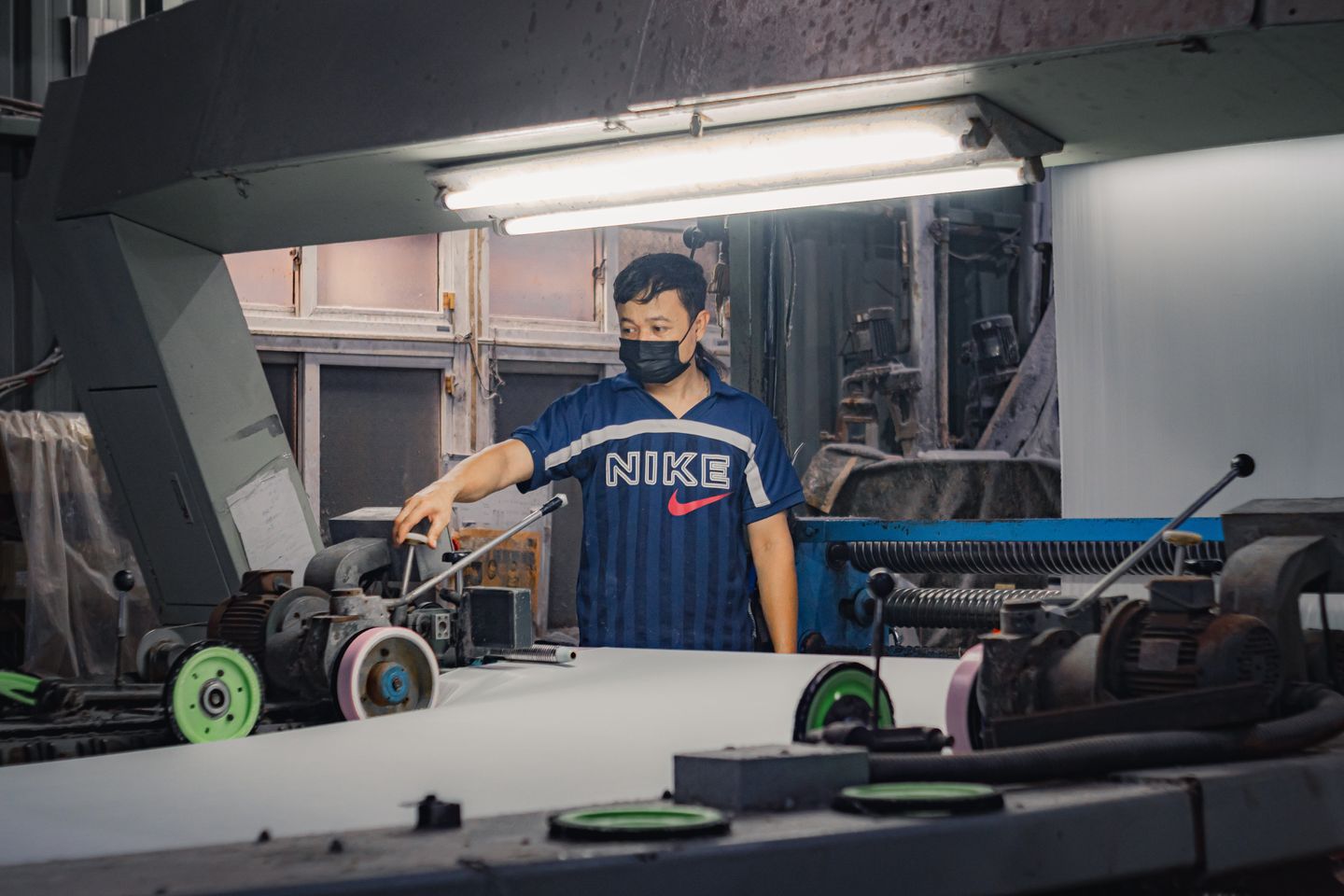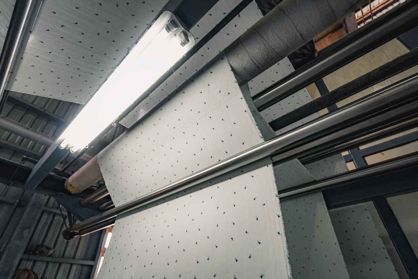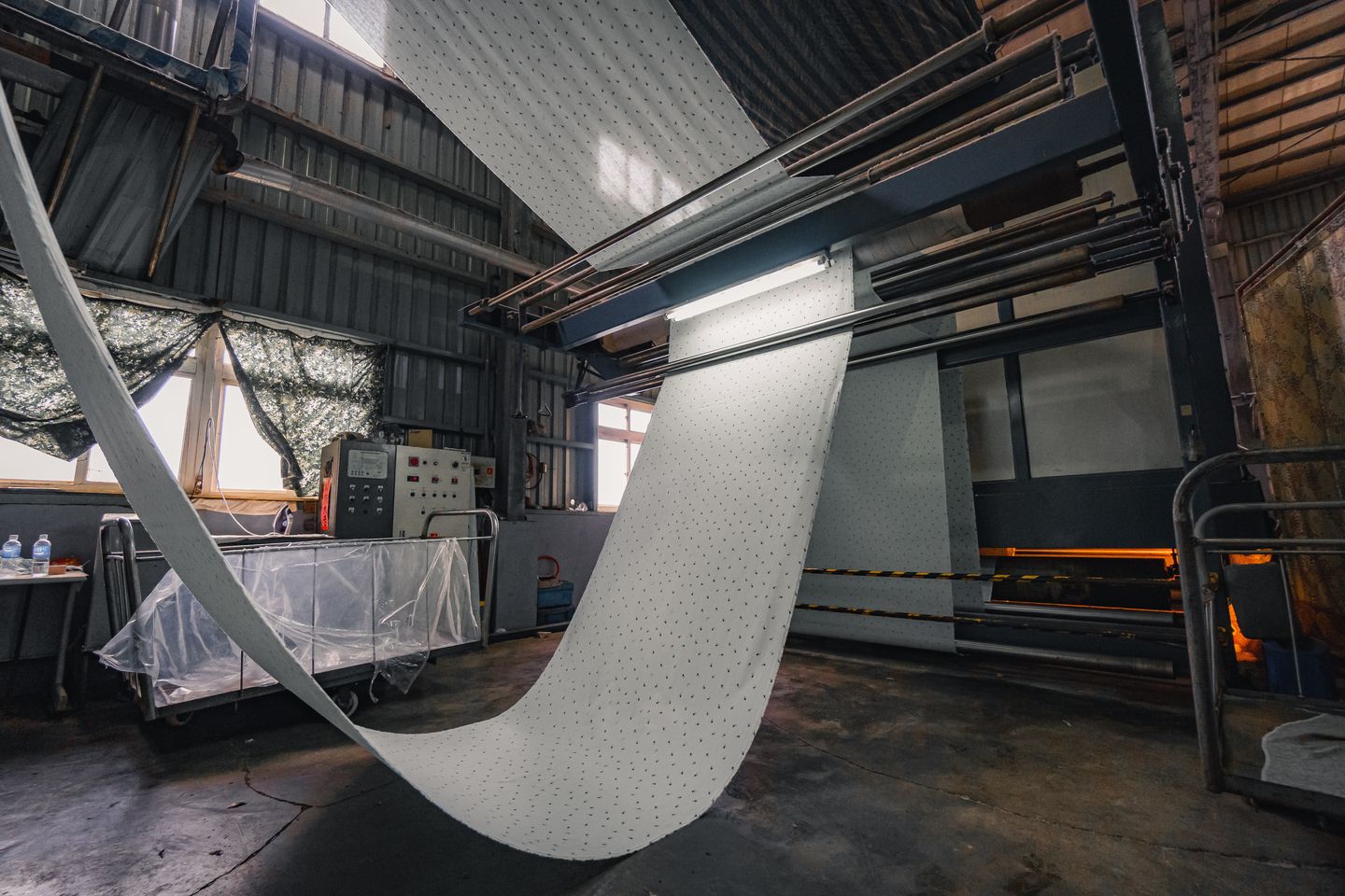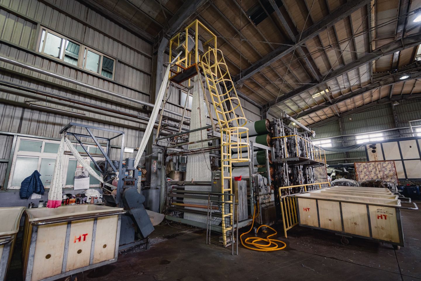 以粗紙管為中心,將一大匹布慢慢的捆,捆成差不多等重量的成布,裹上外包裝,等待出貨。