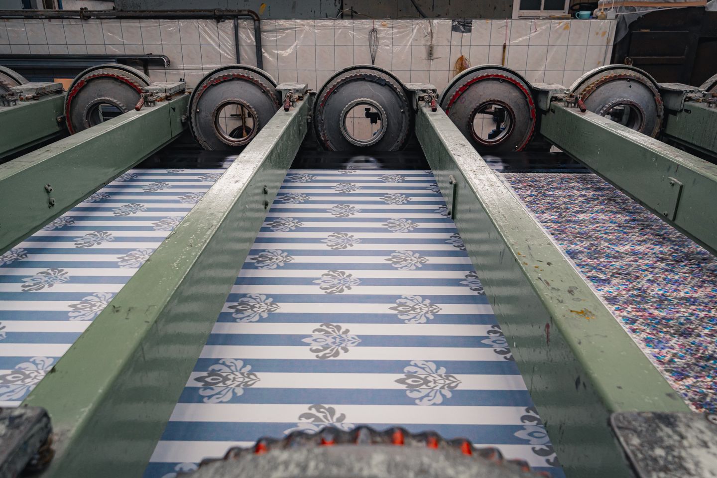 利用鏤空花紋的圓筒狀鎳皮篩網,按一定順序安裝在循環運行的橡膠導帶上方,並與導帶同步轉動。印花時,色漿輸入網內,貯留在網底,圓網隨導帶轉動時,緊壓在網底的刮刀與花網發生相對刮壓,色漿透過網上花紋到達織物表面。